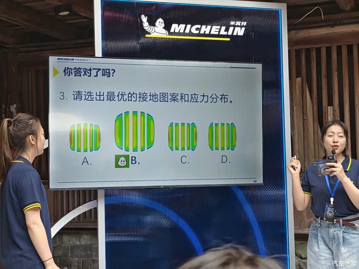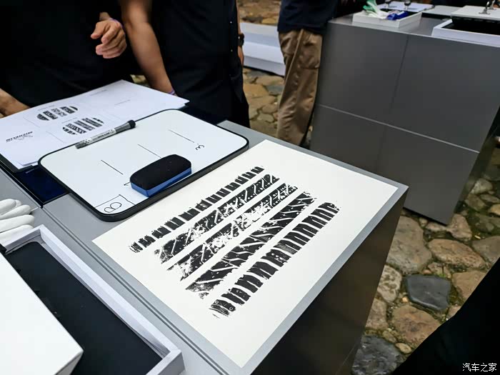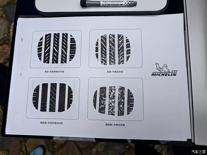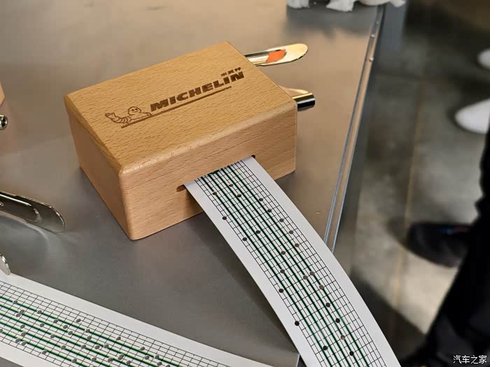 如果大家开过不同的轮胎就会清楚,不同轮胎的橡胶配方其实是不太一样的。在体验环节第一部分,用米其林自有胶料和其他品牌的胶料进行摩擦力对比。可以让体验者直观的感受到在使用不同材质胶料的情况下,米其林胶料的滑动块在桌面上的抓地力明显更高。而采用常规胶料的滑动块就会相对更轻松的容易被推动。对应我们的使用场景,干地加速和干地制动,你会希望轮胎抓地力更强还是不太强呢?,答案显而易见。