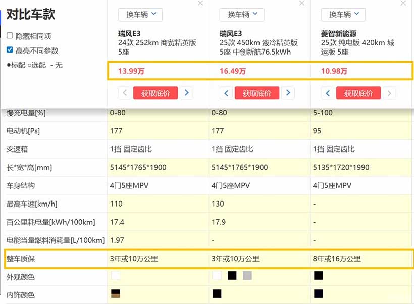 我对瑞风这个品牌还是有点情怀在的,毕竟这台14年的M2修修补补也开了这么多年,首先还是看了瑞风的电车。瑞风E3看着还行,尺寸够大,动力足够。纠结的地方是不好选版本,252km短续航的便宜,价格13.99万;450km长续航好用,但是贵了点,要16.49万。