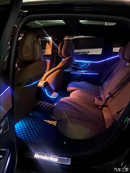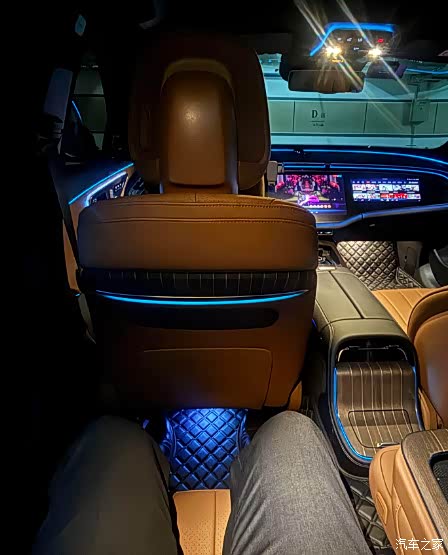 三联屏和氛围灯(夜间效果更明显)内饰很漂亮、座椅都很舒服、后排空间都很大,座椅向后仰了36度,据说迈巴赫是37度,其实真的后排比前排坐的舒服,虽然前排也很舒服,但是“坐奔驰”确实是坐的更舒服更放松