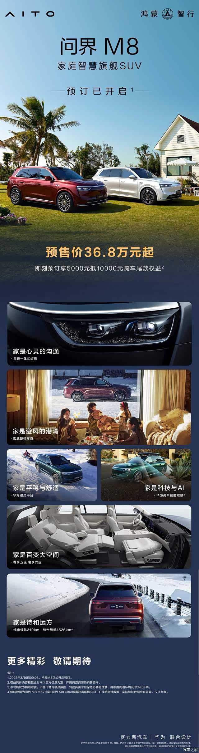 M8预售价36.8万起,填补M7(30万级)与M9(50万级)之间的市场空白,直击35万-45万家庭用户需求;覆盖理想L9(42.98万)核心市场。