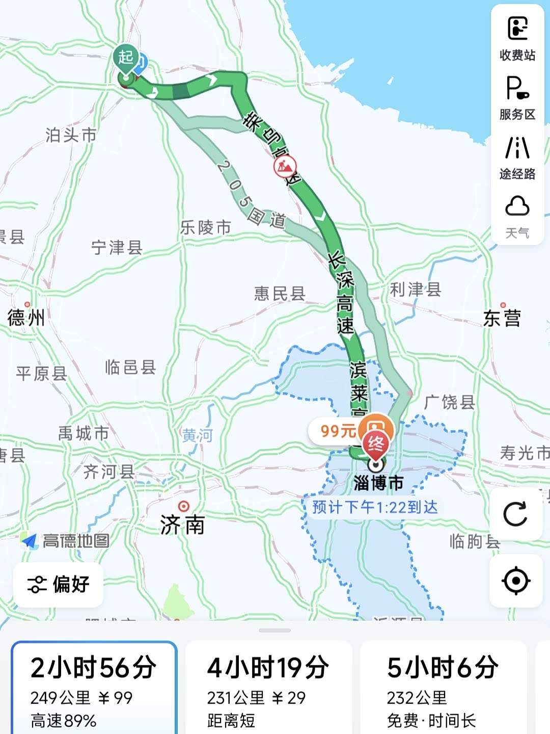 沧州—荣乌高速—长深高速—滨莱高速—淄博,单程250公里,大约用时3小时