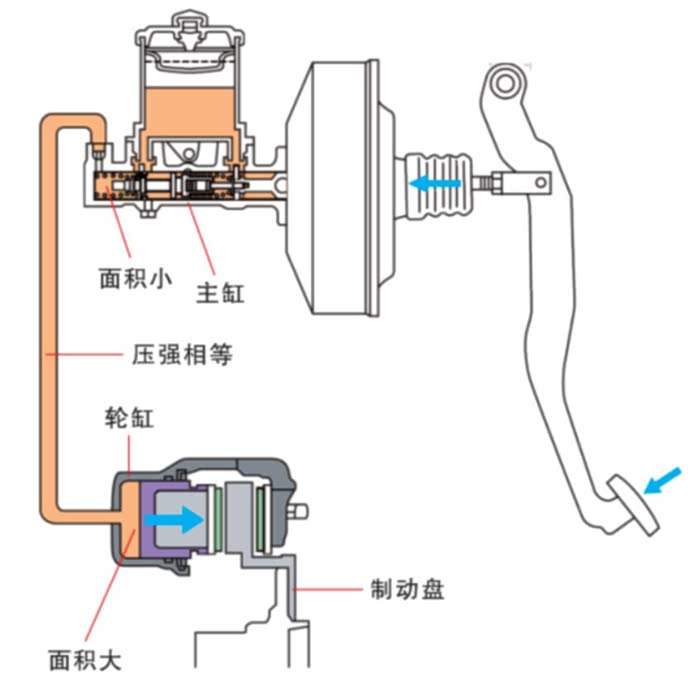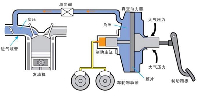 目前大多数燃油车或是新能源车的制动系统都使用真空助力泵来帮助您刹车,在我们踩下刹车踏板后,踏板会推动真空助力泵,再由真空助力泵推动刹车主缸产生刹车液压控制刹车卡钳进行刹车。