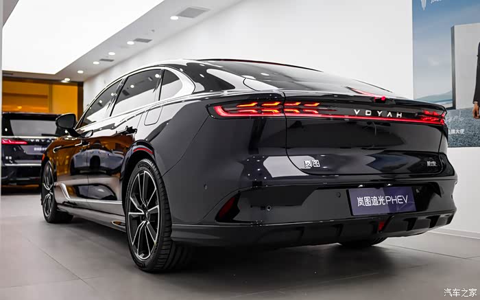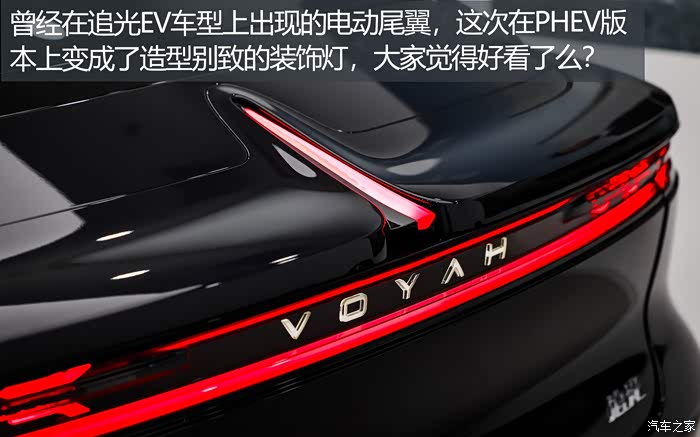 接着我们来看车尾,追光PHEV同样采用了时下流行的贯穿式LED尾灯组,内部光源造型与岚图的品牌LOGO颇为相似,搭配中央的VOYAH字样英文标识,点亮后具有不错的辨识度。