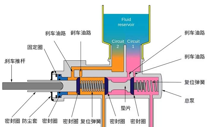 当驾驶员踩下制动踏板时,主缸内的制动液在压力作用下通过制动管路进入轮缸。轮缸内的活塞在制动液压力的作用下向外移动,推动制动器的摩擦片与车轮摩擦,从而产生制动力矩,使车辆减速或停车。当驾驶员松开制动踏板时,回位弹簧使活塞回到初始位置,制动液的压力得以释放,车轮制动器解除制动状态。
