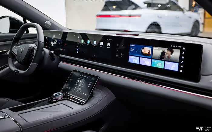 搭配60英寸大画幅的AR-HUD抬头显示,可显示30+类交通信息,以及中控台下方的一块屏幕,科技感十足。