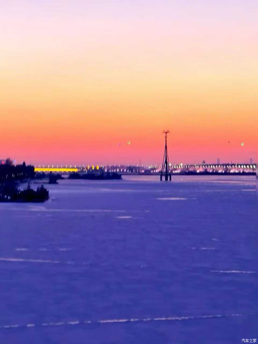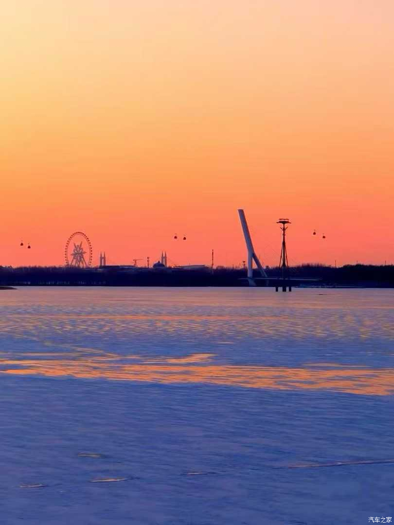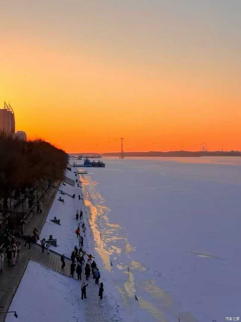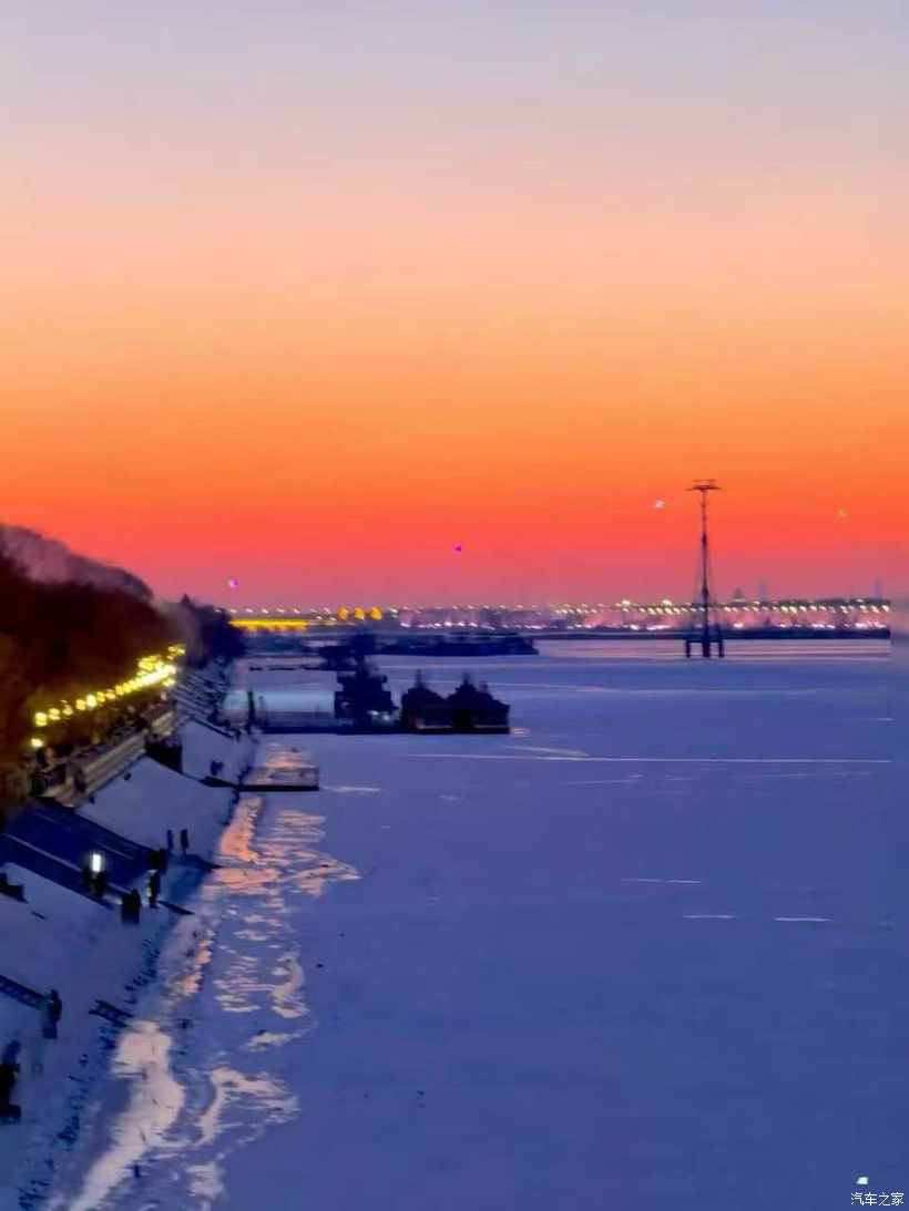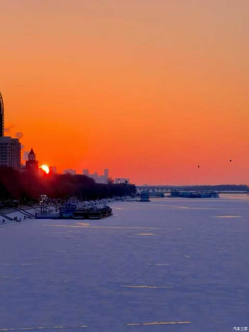 江面并未完全封冻,斑驳冰面间泛着细碎水光,把天边的橙红揉成粼粼碎金,冷蓝的冰与暖调的光撞出温柔的反差。