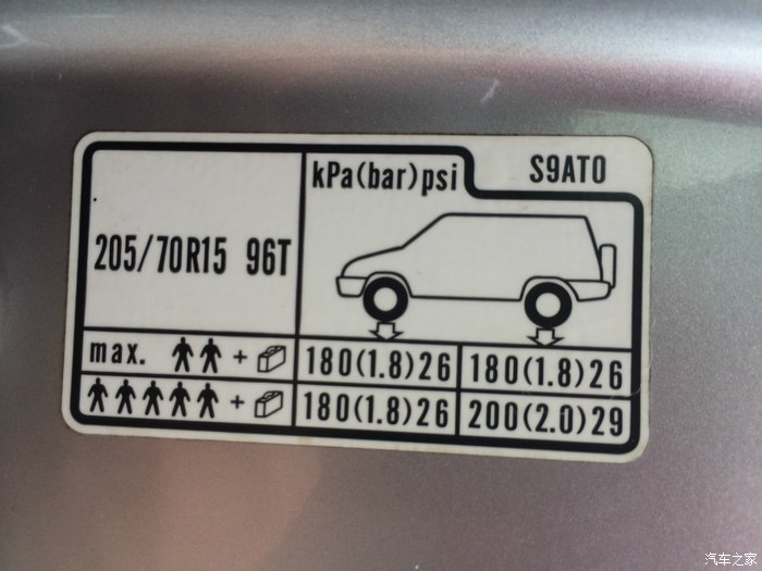 B柱下方的胎压参考值贴纸