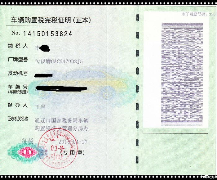 提车篇:4月9日下午车到了,通知我去第二天去提车,10日早上8:00,带上订金收据,合同,所有的证件,来到4S.车已经洗白白,在门口等我,还是那个销魂的凌云翼,然后就是一系列的手续,交税,保险,去上牌,结果我是外地户口,上次办的暂住证没有编码,就没有办成,来不及,就办了个临牌,开了3天,说说感受吧,操控不错,液压助力很灵活,转向精准,就是起步有感觉有点肉,也许是因为没有过磨合的原因,涡轮介入之后,速度马上就上来了,动力澎湃,在市区见车超车,过一些坑坑洼洼的路面能感觉到底盘高,和前双叉臂后多连杆独立悬挂铝合金材料的好处,过弯测倾小,底盘感觉扎实,不松散,看那些轿车在左挪右转的,我直接无视,呼呼一脚油门就过去了,哈哈,视野高,居高临下,行车电脑显示100公里综合油耗10.4,估计过了磨合期还能低点,发动机,胎噪啥的不大,可以接受,至于大家担心的7速双离合换挡咔咔的异响声,我仔细听了,几乎听不到,几个喇叭音响效果不错,我也不是发烧友,感觉够用了,也不去改装。真皮双色座椅,坐着很舒服,柔软度适中,包裹性很好,空间很大,我1.71米的身高,坐进去,头顶还有一拳多的距离,2710的轴距在合资车型里也有优势,后座还带出风口,去办证的路上,去媳妇单位,来到我们公司,引来众多围观的 ,议论纷纷,都问是啥牌子的,都夸不错,国产车想不到越来越好了,还有诸多高科技功能,还没有研究好,智慧传祺系统,是不是还得去开通这个呢,我手机里已经下载了APP了。请买了尊贵版的车友们指点指点。总的来看 ,这车值得入手,国产这个价位性价比最高的,没有之一,我也看过CRV,和途观,同样配置的CRV得22万,途观要27万,要说缺点,第一个感觉速博的车后身,没有GS5设计得好看,再一个无非就是牌子 没有那么响,置换的时候,也许卖不上价,但是这也不是问题,我兴许会一直开下去,也不卖,所以就不是问题了,咱们也不是土豪,土豪也不会买这样价位的车,其实很多人买车不是为自己买的,是买给别人看的,我们就图个实惠,自己喜欢就行了 。临时车牌就到17日,今天是13日,上午,请了个假,去派出所换了带编码的暂住证,直奔车管所。我的妈,全是人,不过我不着急,我已经验过车了,就直奔11号口,费了点口舌,美女帮我办了,然后选好,由于人多,自选号没有合适的,就20选一了,选了个3F978,然后交费,然后取行驶证,然后过了20分钟去南楼取牌,然后找个人安装,带个黑框加安装50元,终于完事,累并快乐着,终于大功告成!