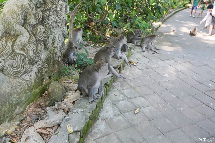不知道有没有经过特殊的训练,圣猴公园的猴子一点都不怕人,只要你手里拿着香蕉,他们就会过来硬抢。给大家一点小提醒,尽量少买一点香蕉,如果有猴子过来讨要你的香蕉,你最好乖乖给它。这不,老公不懂规矩,买了一塑料袋的小香蕉,有一只老猴子跑来讨要,老公就给它一只,但是它赶走了旁边也想吃香蕉的猴子,老公拿着装着香蕉的袋子准备给其他的猴子,结果那只老猴子猛扑上来抢袋子,并且咬了老公一口,幸亏老公穿着厚厚的牛仔裤,腿才没有被咬破。所以,大家喂猴子一定要注意安全,从圣猴公园出来,楼主的裙子也被淘气的猴子们抓的到处是洞。