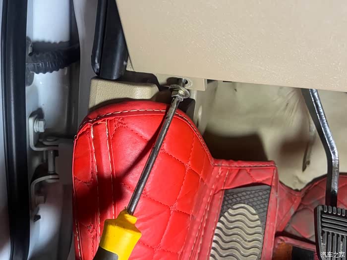 拉门处螺丝.螺丝上面的塑料垫不好取.可以准备个热熔胶棒最好.或者用尖的东西往外挑.拿出来的胶垫边缘做好用透明胶带做个小提手.方便在拆车门好拿出胶垫.