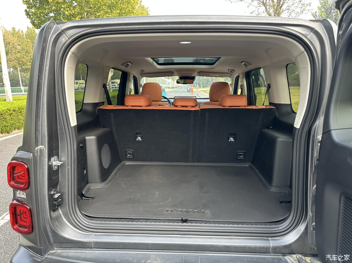 打开后备箱门,能看到车架很粗,看起来用料挺扎实的,看着挺有安全感。我突然发现,后备箱门打开时,一眼看过去有点像士兵坐的装甲运兵车一样,肉眼可见的结实。在没有放平第二排座椅时,新哈弗H9的后备箱空间其实也已经很大了,那种很大个的行李箱也能轻松放。