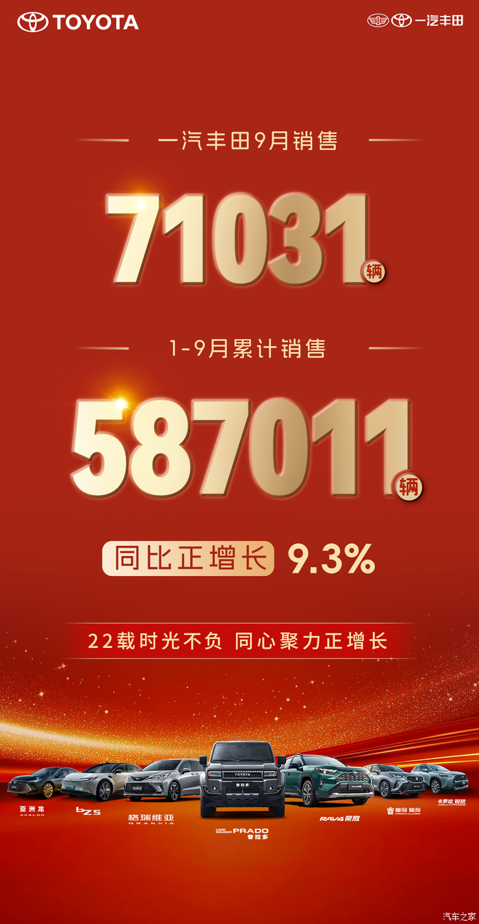 2025年10月1日,一汽丰田率先揭晓了9月的销售成绩单。当月,新车销量达到71031辆;而1 - 9月累计新车销售量更是高达587011辆,同比增长9.3%,这一正增长的态势持续稳健。