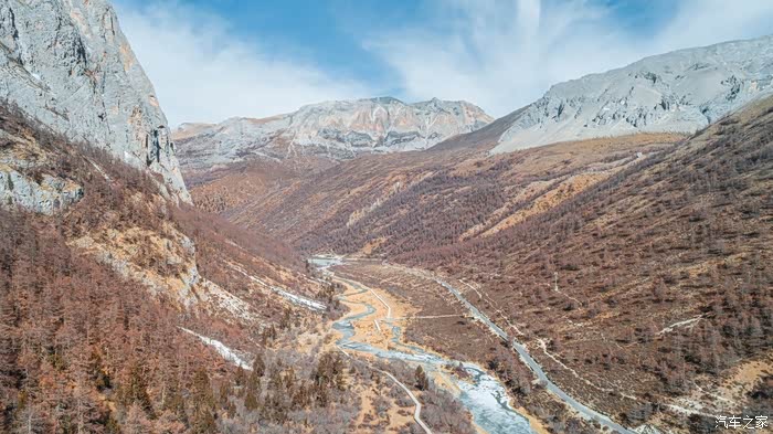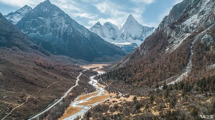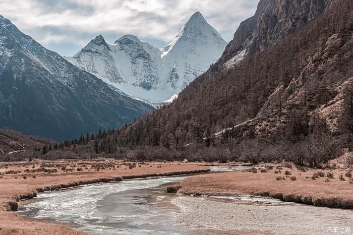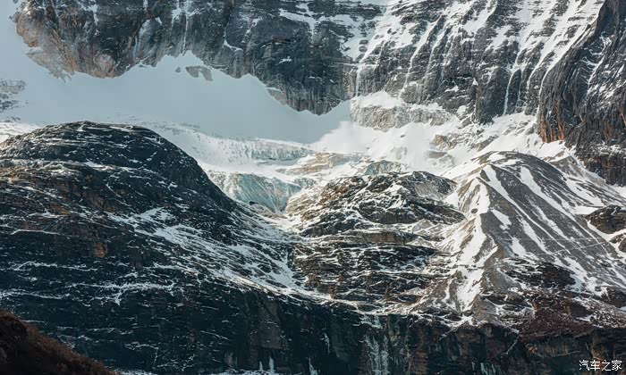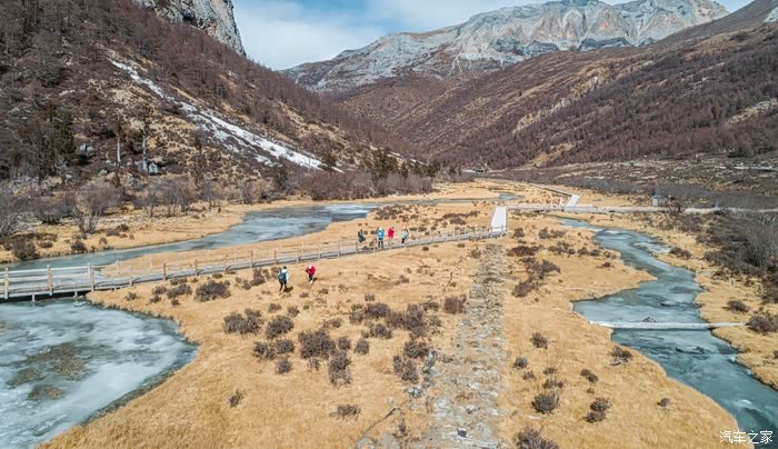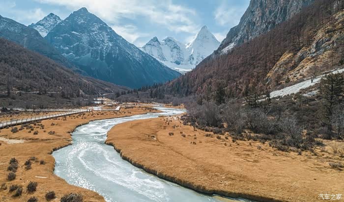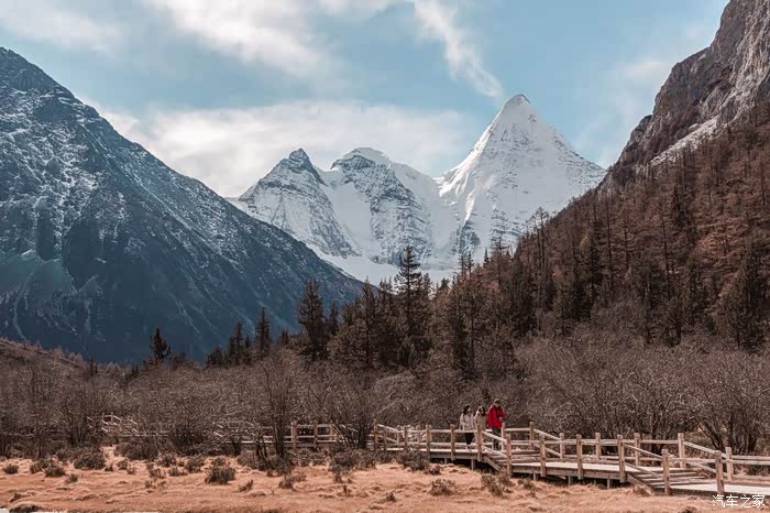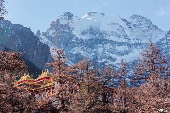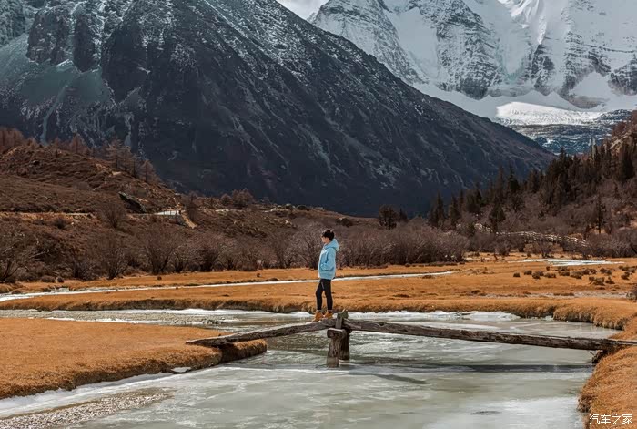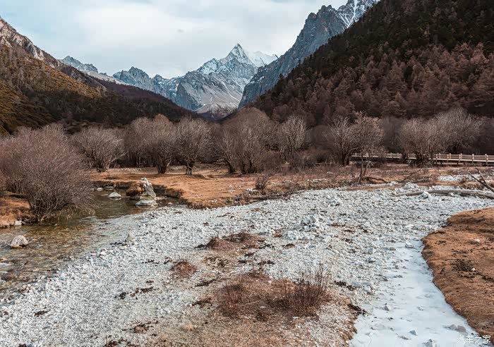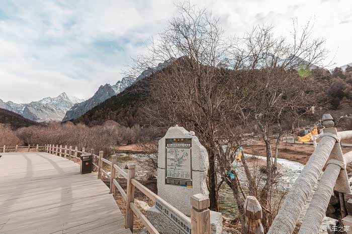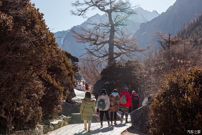 从下车点到冲古寺游客中心近500米的缓坡路段,一边让心肺适应着周遭的环境,一边打量着眼前景象。虽没有如夏天那样盎然生机的绿色,也没有像秋天那样满眼的金黄,但深褐色的落叶松和树干在雪山的衬托下也格外与众不同。