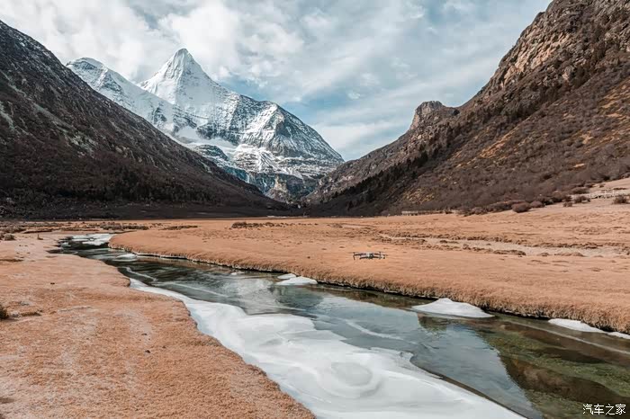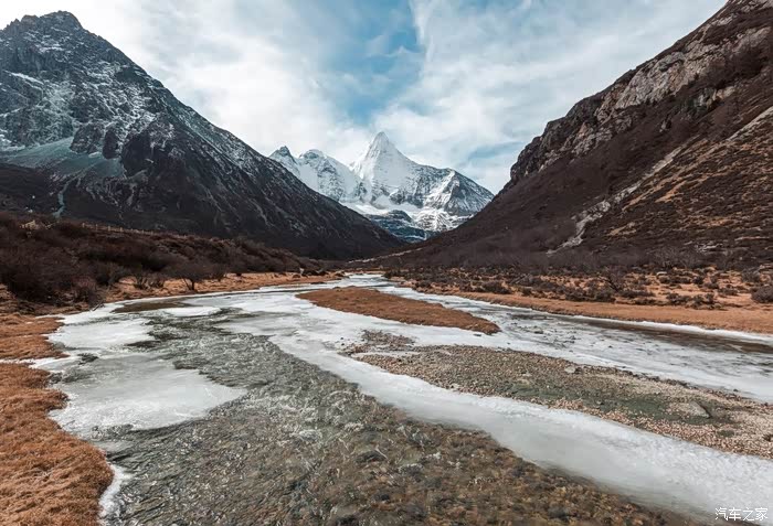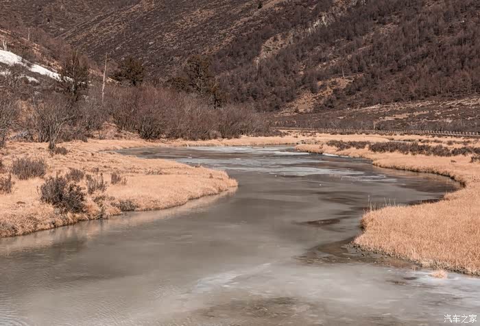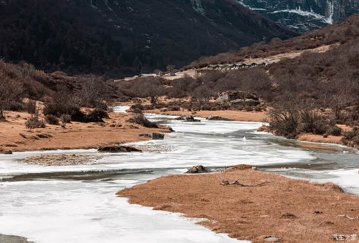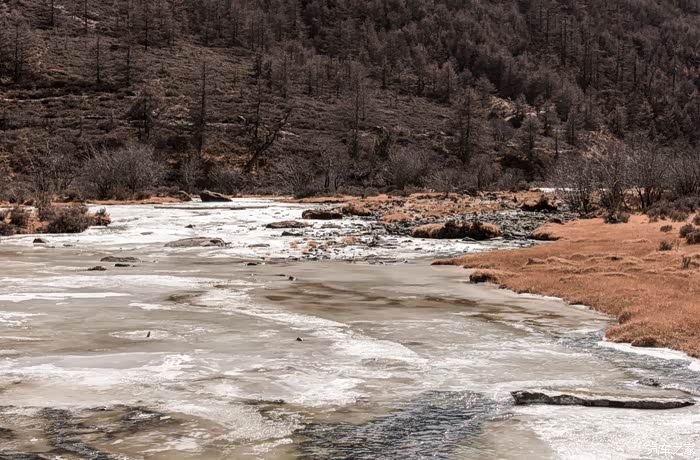 山上的冰川 融水 顺溜而下,水面上有一些浮冰,但即使在这零下十来度的环境中,河水也没有完全冻住。