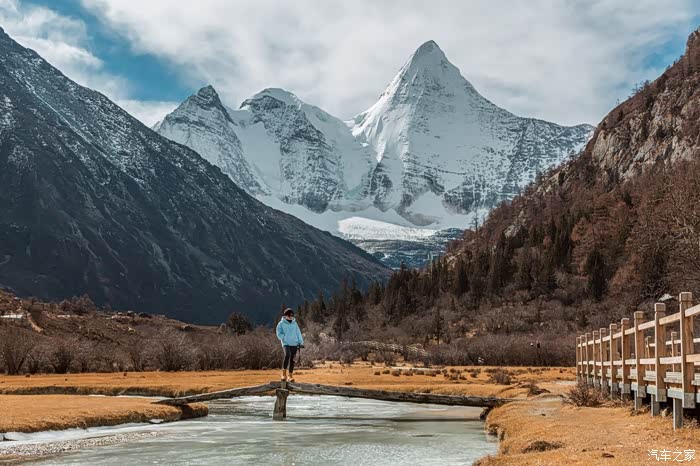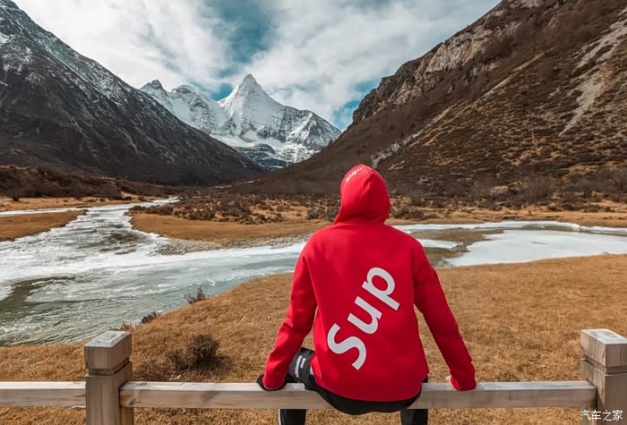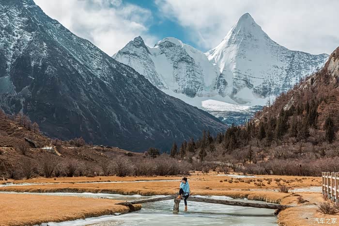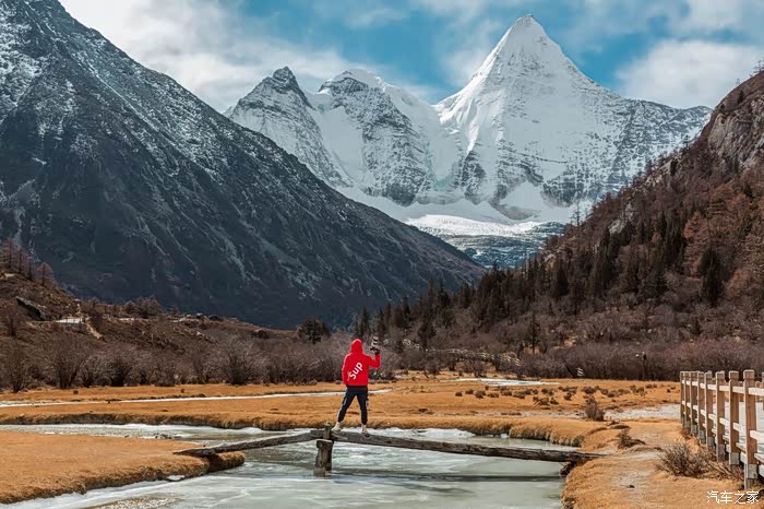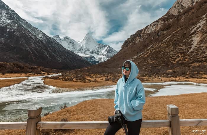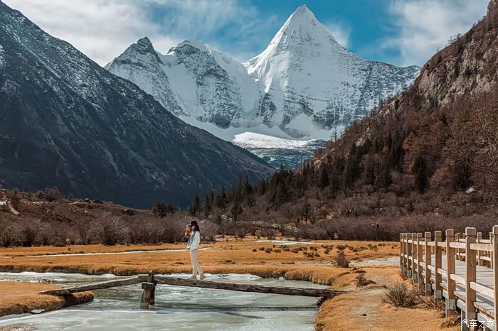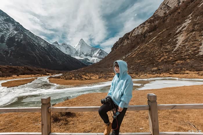 阳光正好,又恰遇见正对着央迈勇神山的一座小桥,我们在此一边补充能量,一边面对着神山留下各自个性的身影。