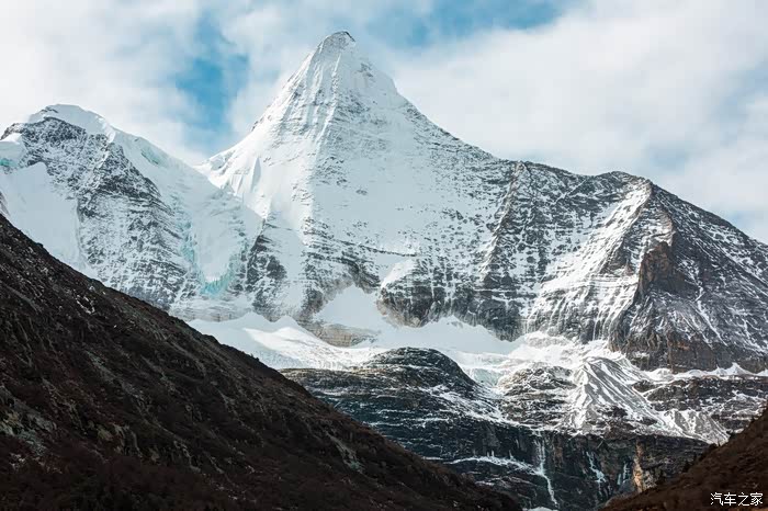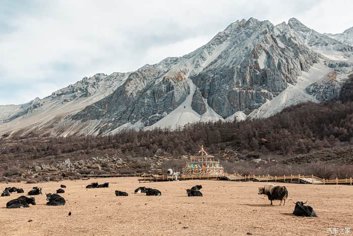 乘坐景交车直达洛绒牛场,刚一下车,跃入眼帘的就是如金字塔般高耸入云的央迈勇神山,洁白的雪峰下面可以看到纯净的冰川,海拔较低的花岗岩岩体将其包围。