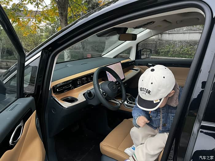进入车内,传祺E8+的座舱设计巧妙融合了现代科技感和居家温馨氛围。大量软包材质的使用,如座椅、门板、中控台等区域,手感细腻且触感柔软。木纹饰板作为点缀,有效提升了内饰的豪华感和档次感。超低地台设计和上车扶手,对于家里有小孩和老人的用户来说非常贴心,无需费力就能轻松上下车。