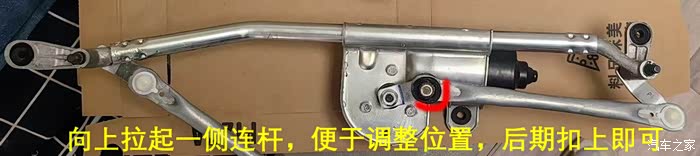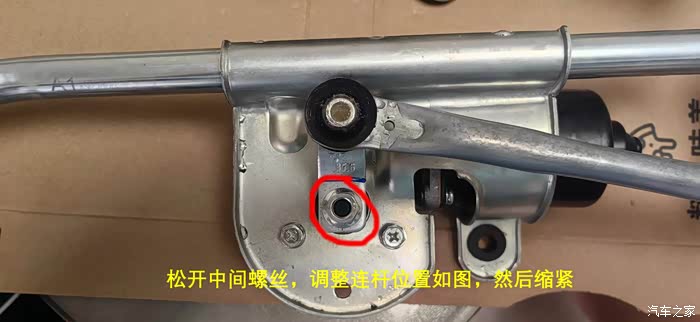 此时用力向上拉起左侧连杆(连接部位是卡扣式万向节),用10mm六角套筒松开中间螺丝,务必按照照片中的位置和角度(其实就是雨刮器的初始位),然后大力固定好。