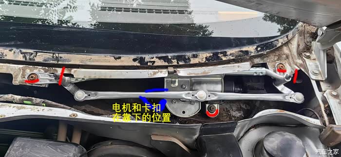 雨刮器连杆下边是电机,先拿下一个U形的金属卡箍,拔下电路插头。