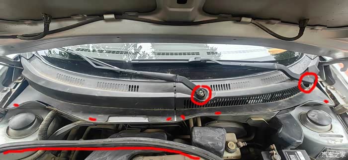 先向下和向车前的方向用力,卸下副驾侧集雨板。顺便说一下,红色标记的部分是空气滤芯盒,有说副驾驶侧漏雨的注意检查这个位置。
