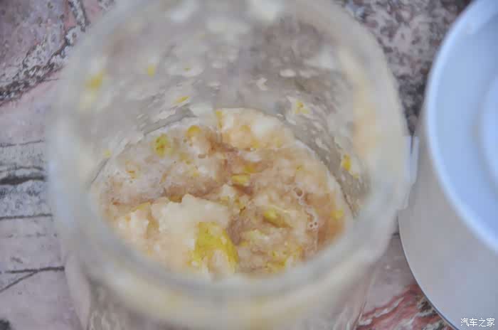 榨汁中,一定要要不断的手摇晃果汁机,这样可以充分达到搅碎水果的效果。大家可以看到,搅碎的梨肉很“漂亮”,达到了我的逾期效果。