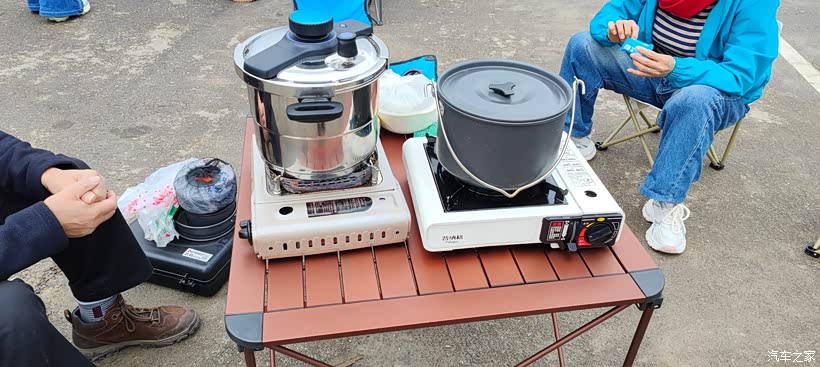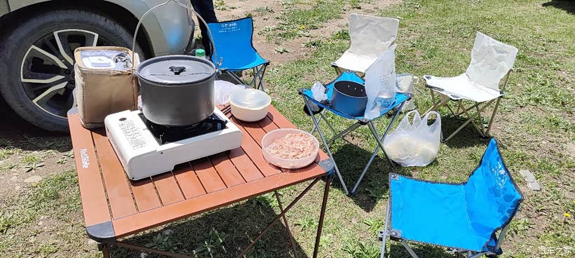 从后备箱依次拿出桌子,椅子,再拿出两套套锅,方便洗用。安放好桌子后,再放上两个卡式炉,一个煮饭,一个煮汤。
