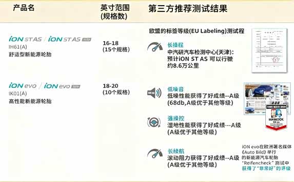 对于了解EV轮胎的车友们应该知道,EV轮胎还能通过减小车辆在驾驶中的滚动阻力,来提升续航能力。然而韩泰并没有因为追求低滚阻而舍弃了其他性能指标:在利用优化的硫化技术减小滚动阻力、提升续航的同时,制动性能也同样有所提升,这体现了韩泰对安全性的重视。在今年德国著名汽车杂志Auto Bild进行的最新轮胎测试中,电车的专用性能轮胎—iON EVO获得了最高荣誉,在所有参加测试的轮胎中,iON EVO轮胎在潮湿和干燥表面上的出色操控性和制动性能均获得了非常优异的成绩。这也是我对韩泰保持信心的重要凭仗。
