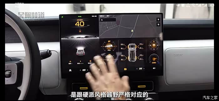 大屏左边是相当于传统的仪表屏,显示车辆速度、档位、电量、实时电耗、估计续航里程、时间等行驶信息和状态(注意大屏上的英文off road,以及前方配景,下面要考。)