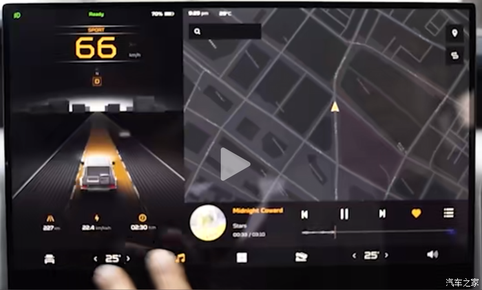 注意大屏左边,此处英文为sport(驾驶模式),但是配景从刚才的山野换成了城市建筑,不知道将来这里能不能和导航地图配合,做到数字孪生的水平。