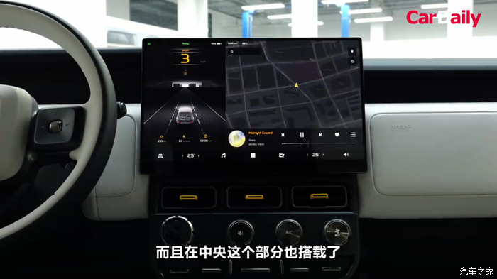 单独截了一张大屏的特写,可以看到导航左上角有显示时间和温度。整个大屏的固定菜单在最下面,从左往右分别是车辆控制、主驾空调、音乐、App应用、驾驶模式、副驾空调、音量。