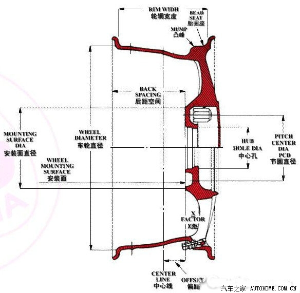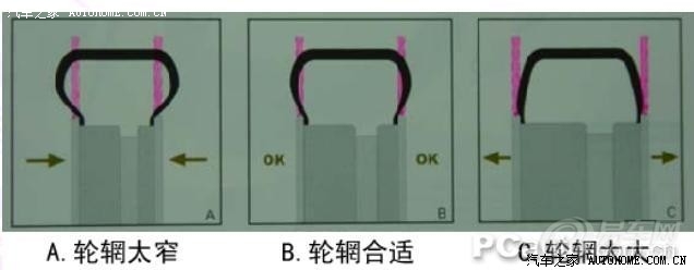 从表中可以看到,每个J值都有一个建议的轮胎宽度,比如7J的轮毂,标准胎宽是215,当然也可以装小号的205,也可以装大一号的225宽度的轮胎,但都不是标配。