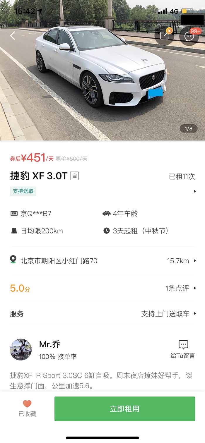 于是我就想着开学回北京了也得租一台骚气一点儿的车型来赚赚回头率,说不定还能帮一些小学弟小学妹搬搬行李啥的,于是这次在某凸租车上的筛选条件就是五门轿车,够骚气,还不贵的那种,最后选择了一台捷豹XF,还是进口3.0T的版本