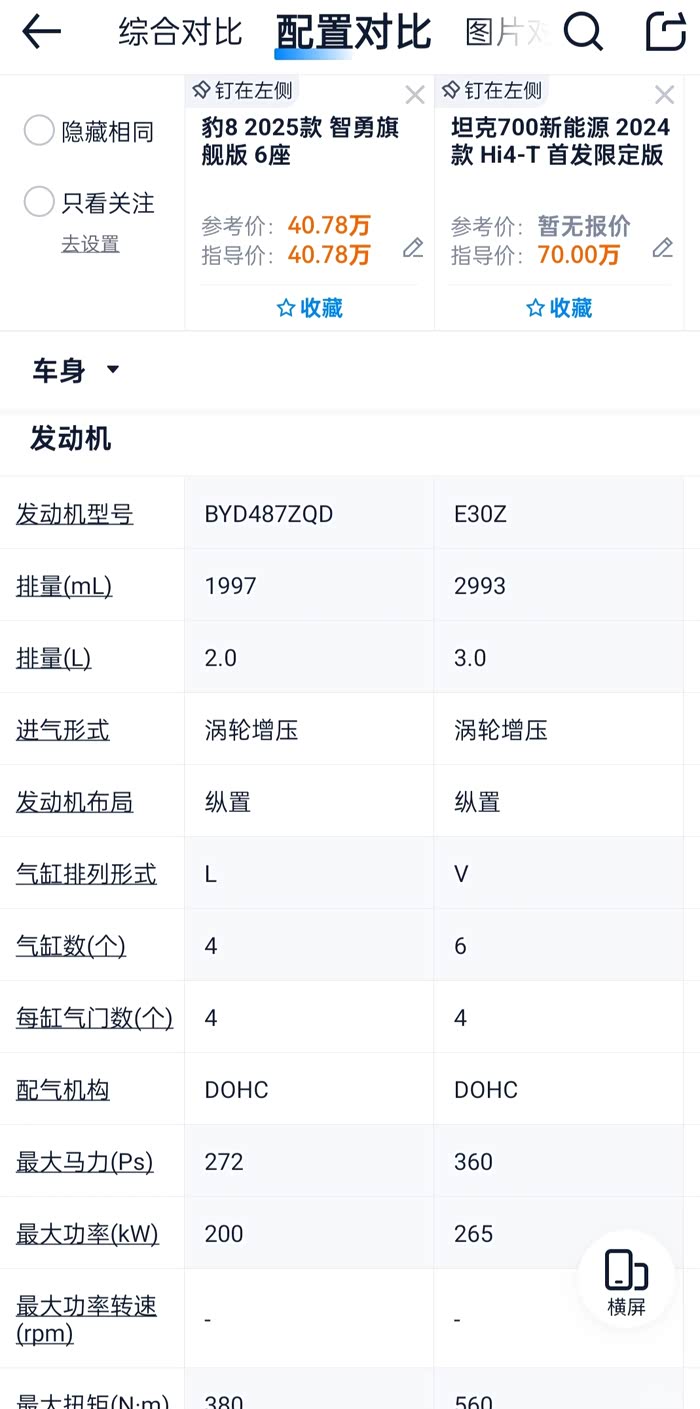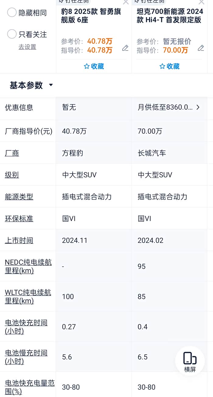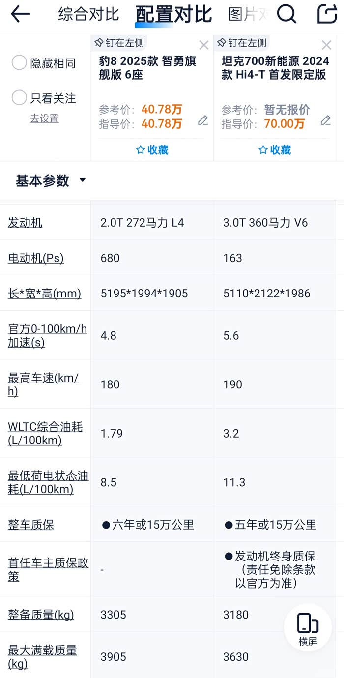 总体而言,坦克700更具有豪华内饰、品牌影响力以及相对较强的越野性能;豹8更具科技感、智能驾驶辅助系统和较低的油耗。两者最高配相比,在核心的动力系统上,豹8并不落下风,甚至在续航、油耗和提速等方面豹8有不小优势,而价格上豹8近41万,坦克700达70万,相差近一倍,相比之下,豹8性价比吊打坦克700。