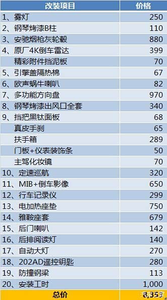 很多朋友问改装费用,趁着国庆有空整理了下给大家参考。总共8K多,买风尚还是舒适大家各自掂量。风尚性价比高,改装潜力大,想当年提的途观也是性价比超高的2T视野版,改了自动泊车、315、日间行车灯,感兴趣的可以看我另一篇主贴: