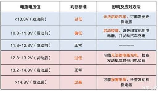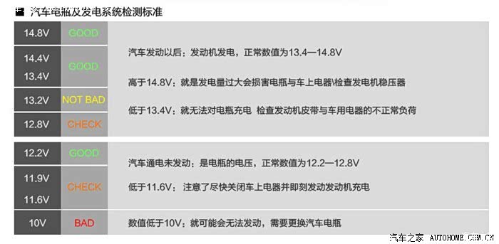 蓄电池电压不启动时候12V-13V,启动后,14V-13V波动,如果电池馈电,启动后电压高,如果逐渐充满电,电压会降低到13V左右。