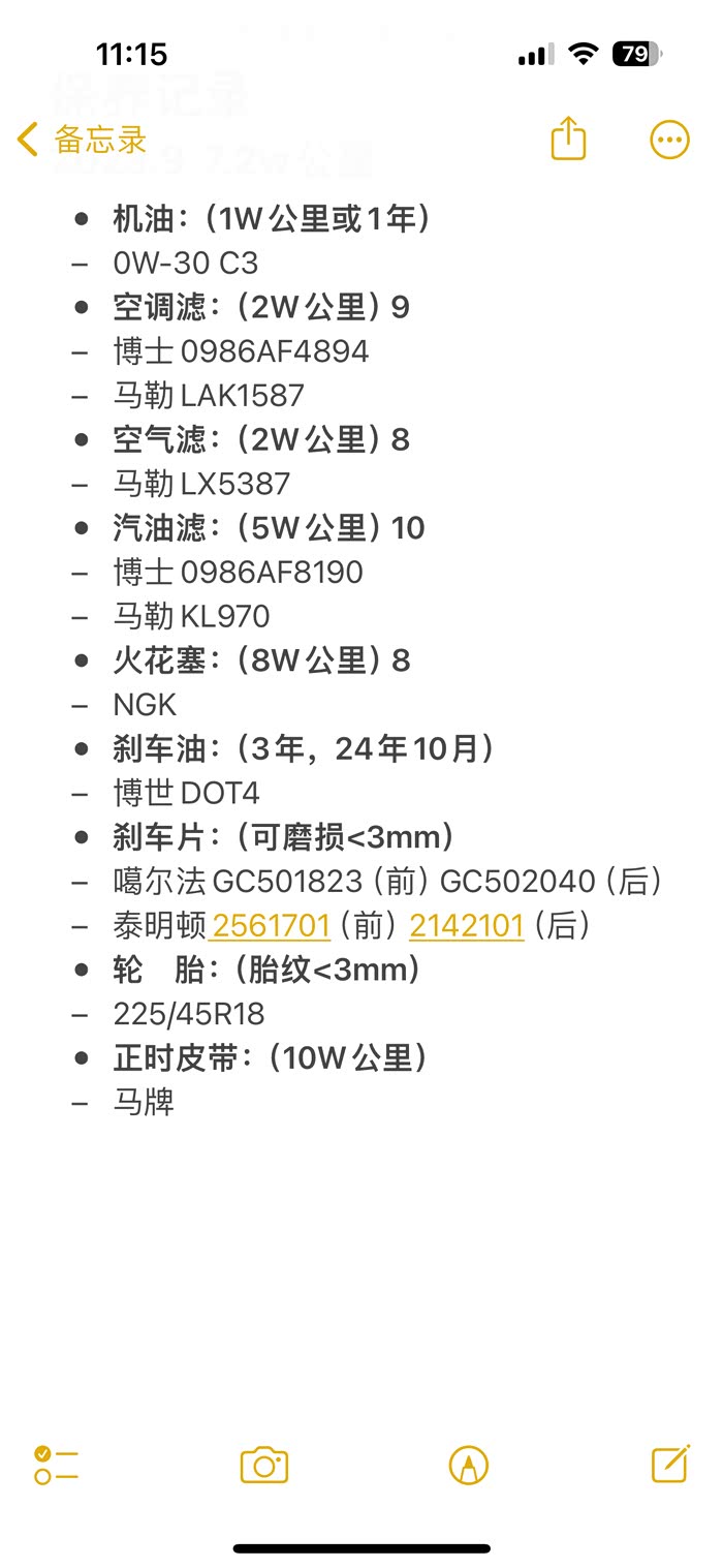 滤芯方面,空气滤芯马勒就行,自己动手换超简单,教程百度,不要去4S店被人坑一两百了!空调滤芯也不用迷信曼牌,毕竟常换,博世、马勒等等都可以,不过3系车型自己装麻烦,花30块让师傅装。汽油滤芯可以选择曼牌,5万公里换就行了,加的都是95#汽油杂质很少的,经常去小加油站就增加更换频率。机滤没啥好说的,各类平台的保养套餐都包含,选个知名品牌就行。