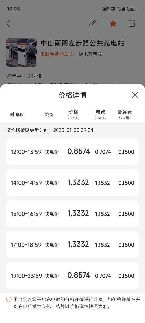接着大家可以查看充电桩收费时段的价格,每个桩的价格都不一样,收费时段价格也不同,结合自己的时用车情况,选择符合自己时间段来充电