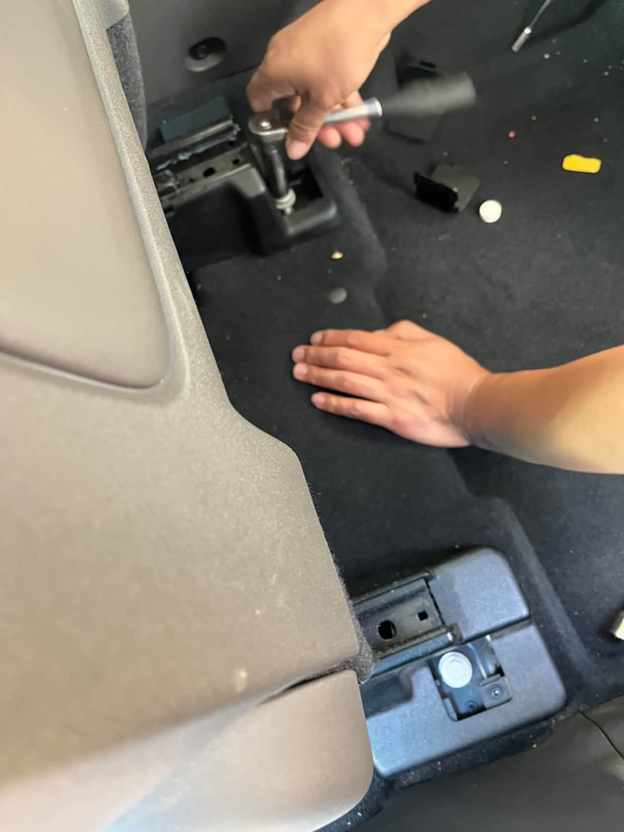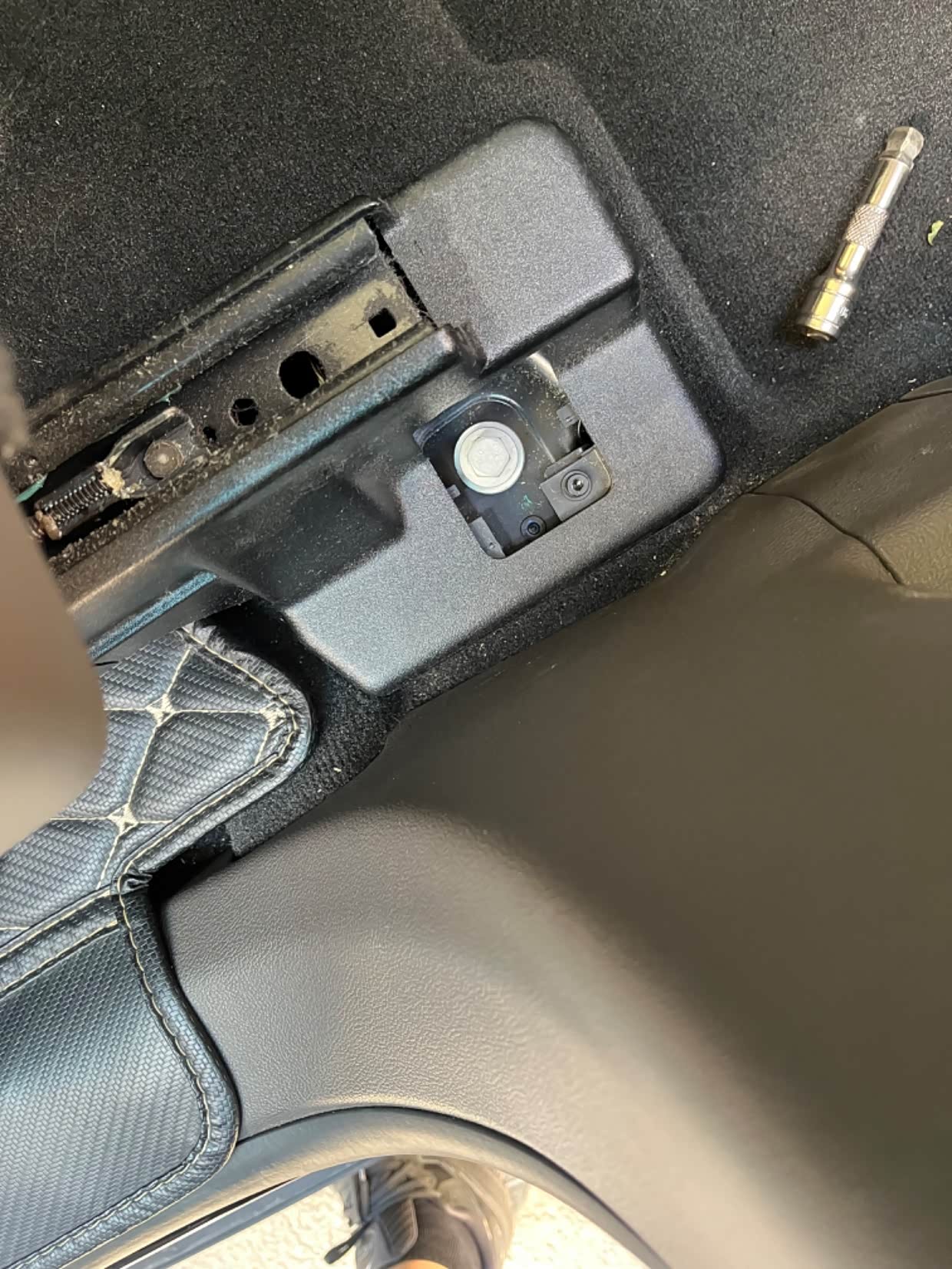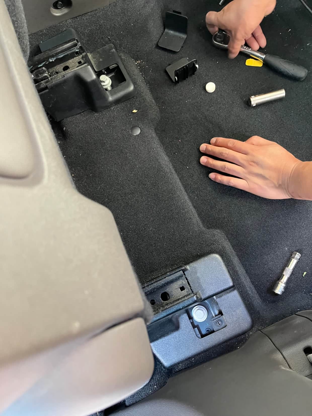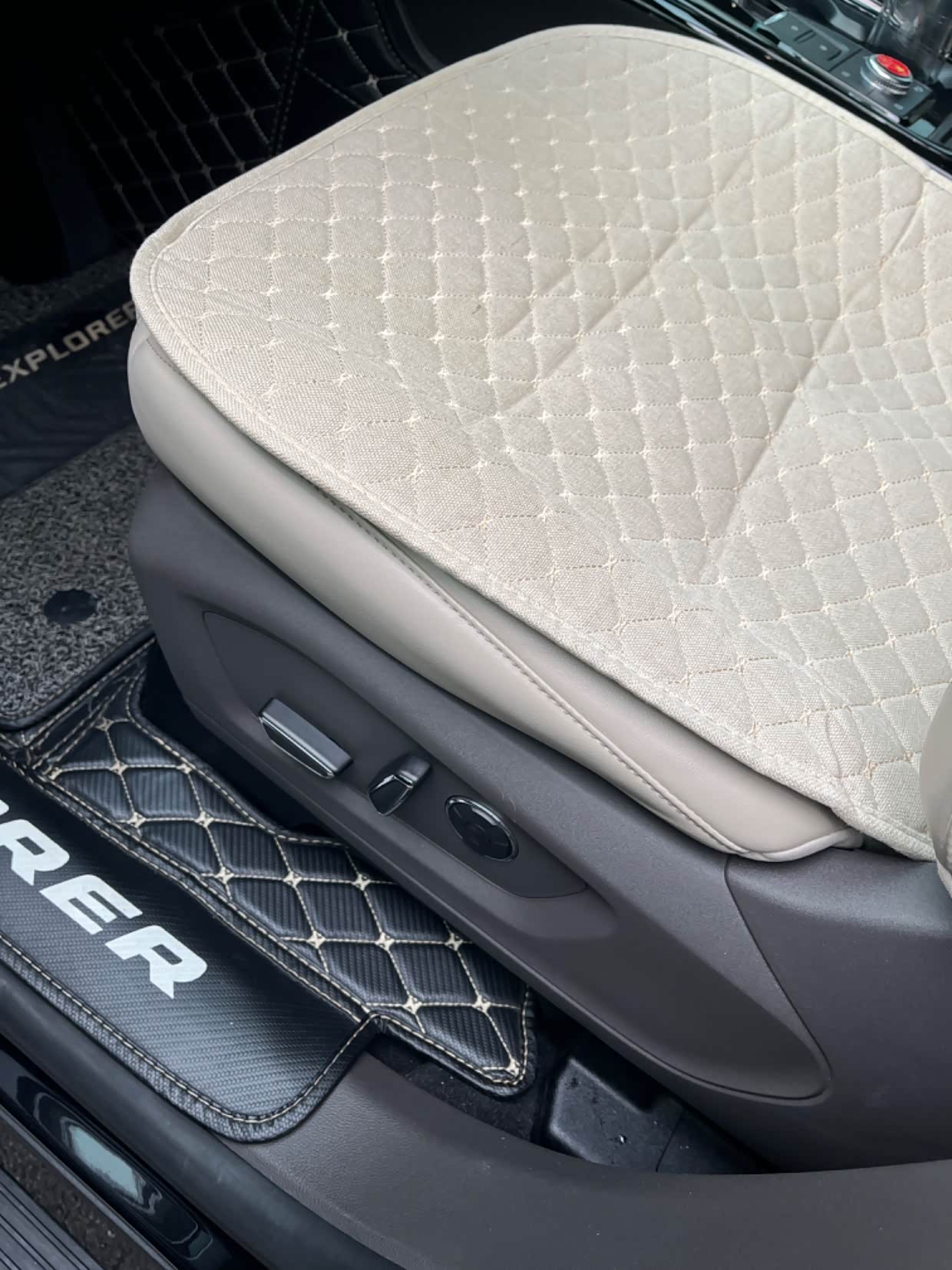 2020款探险者,跑高速的时候,我喜欢把座椅位置调到最高处,视线好,有利于安全驾驶,但是会出现一个问题:坐垫前倾角度不够,就是坐垫前端会顶大腿,开车时间久了,很不舒服。这个问题困扰了我一段时间了,因为原车座椅调节功能用到极限,也无法在最高位置处调整一个比较适合我需要的坐垫角度。一个偶然的机会,在车友群咨询大佬,有人给出了一个看似简单,其实操作起来也很简单的解决办法:就是直接在座椅底座螺丝钉上增减垫片厚度改变座椅倾斜角度。听起来确实是这个道理,马上直奔维修店,正好赶上师傅有空,简单说明来意,师傅心领神会,马上开搞。