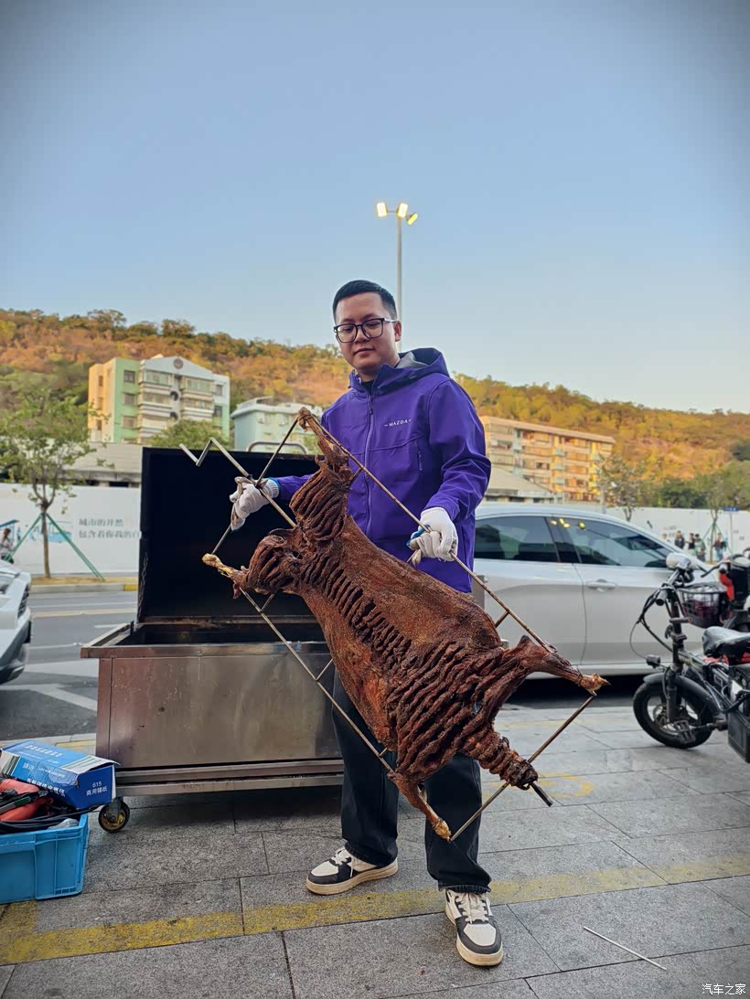 采摘的快乐还没消散,烤全羊的香气就霸道地勾住了所有人的味蕾,这可是本次年会的重头戏!农庄师傅围着烤炉忙得不亦乐乎,整只肥羊在炭火上慢悠悠旋转,秘制酱料层层刷上,油脂滋滋作响,滴落在炭火上溅起阵阵烟火气,焦香混着肉香,飘满了整个农庄,让等待的车友们直咽口水,连原本在果园撒欢的小朋友,都乖乖围在烤炉旁,眼睛直勾勾盯着烤羊,可爱到犯规。