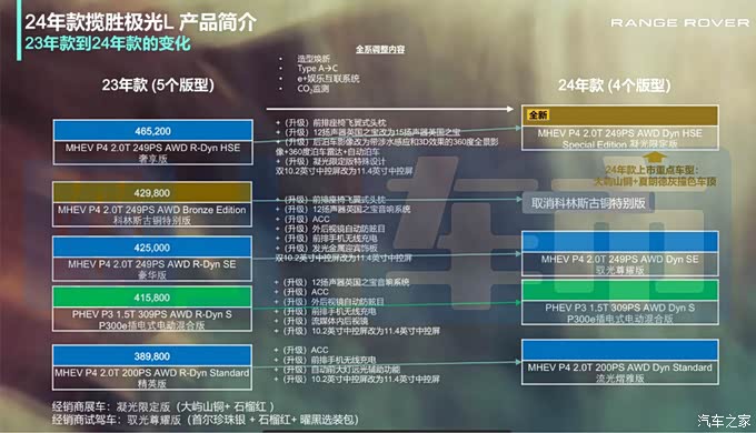 动力方面,预计2024款揽胜极光L将沿用现款动力,搭载2.0T+48V轻混系统,匹配9速手自一体变速箱,并配备四驱系统。混动版搭载1.5T三缸发动机+电机组成的插混系统,系统综合功率227kW。