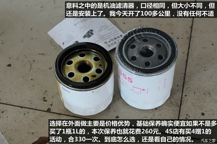 昨晚前后轮互换和节气门清洗就去换机油机滤,我是在两家店换的,毕竟轮胎的东西交给轮胎专业店铺更放心。在某汽车用品网购买了推荐的机油机滤,前后应该花了340左右,因为有剩余一瓶1L机油,所以实际花费也就300元,40元的工时费,这个价格比4S店要便宜一些。至于到底选择在4S店还是在维修点大家自己选择,尤其是今年国家有规定允许在外保养,这对老百姓是好事,不会再有霸王条款,也有了竞争。