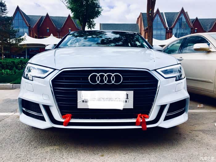 这样一来基本上就只有小三了,周六独自去了一家ssss试驾,前面说过再不啰嗦,销售报价裸车22万,按揭六成30期,贷三年,低息3300左右,手续费4400,还要必须三年联保,加装一万多的QJ包:贴膜、记录仪、电动尾门之类的~唉~好吧,只要领导对空间无异议,就可以下订单了。回家向领导汇报,说明天去附近的ssss店里感受下空间,够用就订!刚说完,一朋友来电话询问工作的一点事,得知我看上了奥迪小三儿,说她老公以前的徒弟现在就在离我家不远的那家ssss店里做部门经理,肯定能给个更大的优惠~这及时啊,赶早不如赶巧~第二天一早朋友联系好了这位经理,到店问了问情况,直接报价21.1万,除了贴膜、两年的保险在4s做,再不需其它任何加装,首付六成18期无息按揭,送脚垫,尾箱垫、香水、油掸子等五六样东西,两个半月之内到车,也有提前的可能尽量申请~结果只等了半个月,朋友就通知我车到了。提前一天去店里办了原车置换过户手续,买了两年的保险,第一年7000多,第二年的5000多,验车发现B柱上方与天窗接缝的地方不知道被什么东西碰了一个硬币大小的坑,掉了米粒大小的一块漆,因为新车有白膜盖着,4s店接车的时候也没发现,朋友叫来了负责接车的工作人员和他们老总来看,几个人一个劲表示歉意,协商解决办法,一是换辆新车,但店里再没有现车,要继续等厂家发过来,时间不确定,二是紧急修复,做钣金喷漆,第二天就可以取车。检查了其它方面的问题,一切正常,考虑到我的polo已经过户了,如果等换车,这段时间就无车可用了,这个损伤也没什么安全性能方面的影响,修好了也不影响美观,虽是新车,也无所谓了,不想给朋友添麻烦,就决定钣金喷漆吧~作为补偿安慰,送了5次保养,加上首保,总共6次免费常规保养,朋友赶紧安排修复,钣金师傅说第二天中午可做好。第二天去提车,新车已清洗干净,脚垫后备箱垫,安全座椅等东西都已安装妥当,磕碰处也修复如初~检查了各种灯光油液,听了听发动机,一切OK~办理了会员,领瓶红酒,积分换了个钥匙包、儿子喜欢的小黄人旅行箱和背包,在工作人员的列队欢送中开始与小三儿的快乐旅程~啰啰嗦嗦的提车过程到此结束~正赶上国庆节前提车,挂个临牌先裸奔半个月~开始上图:先来张霸气的前脸镇楼~