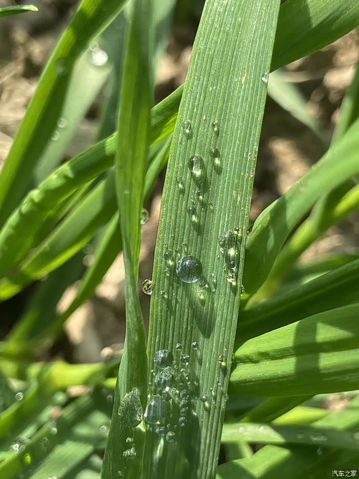 晶莹透剔的挂在叶边,有如散落的珍珠,阳光下闪闪发亮。