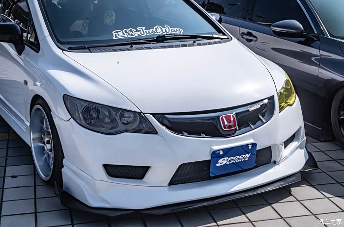 第一辆展示的基本是主流改法,改了全套常规FD2的包围套件,轮毂则改了前后款式不一的白色鸳鸯轮,都是比较竞技的款式。其实从轮胎型号、刹车盘大小也能多少看出这台车是朝着竞技分享改装的,毕竟发动机也是有升级移植的,进气也是升级成了无限(mugen)的高流量盒,至于引擎缸体具体是K20还是K24玩法就不太清楚了。