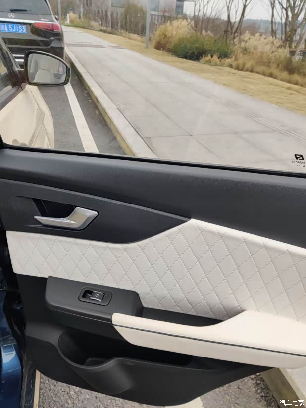 门板包覆也是全面的做好。扶手是米白色皮料搭配黑色骨料,门板中部同样是这样,还搭配了椭圆菱形造型。所有平时会接触到的区域,都要做到统一。