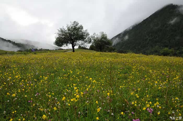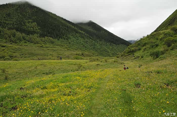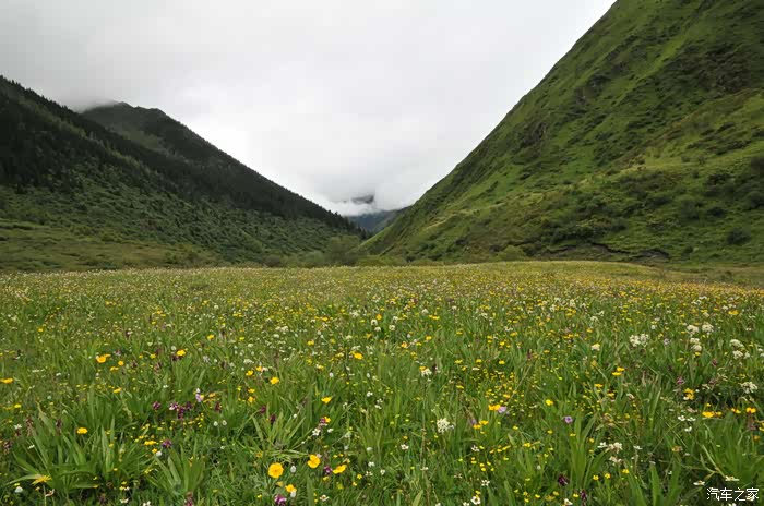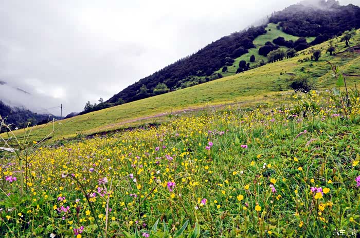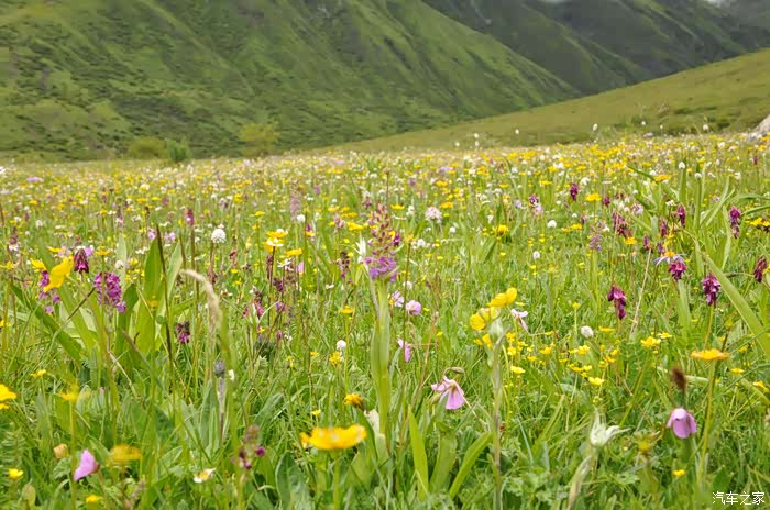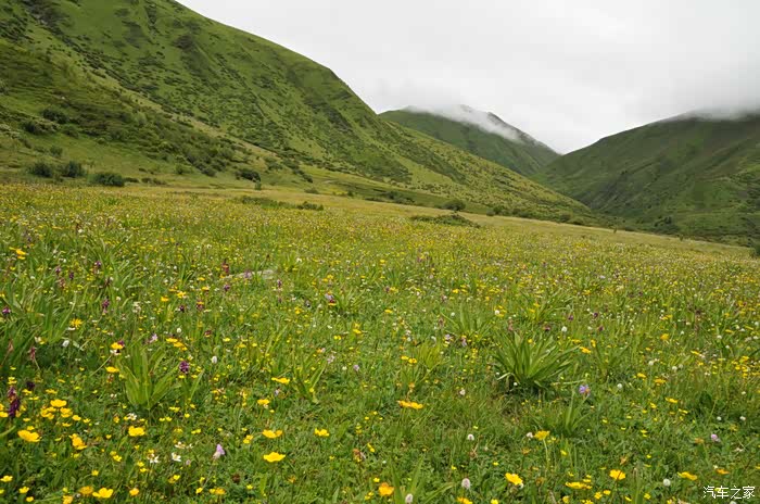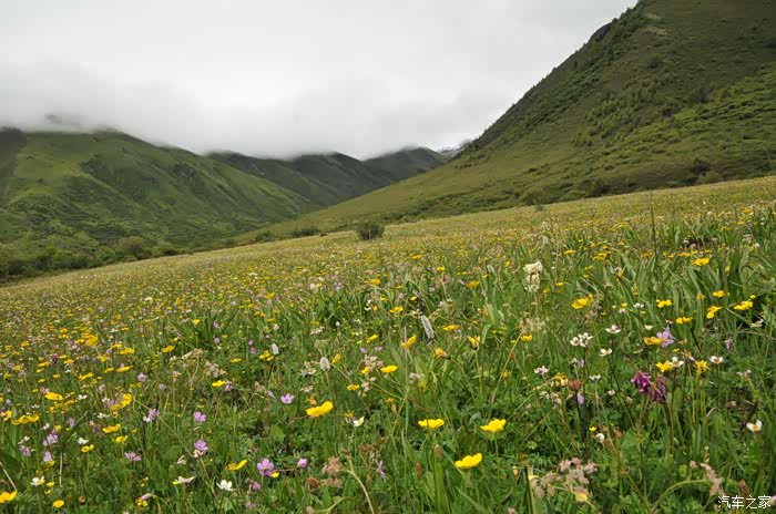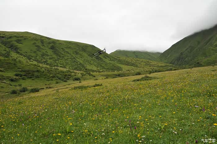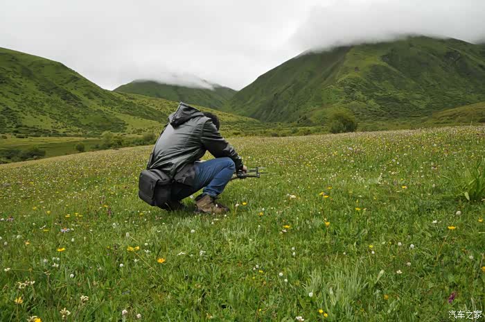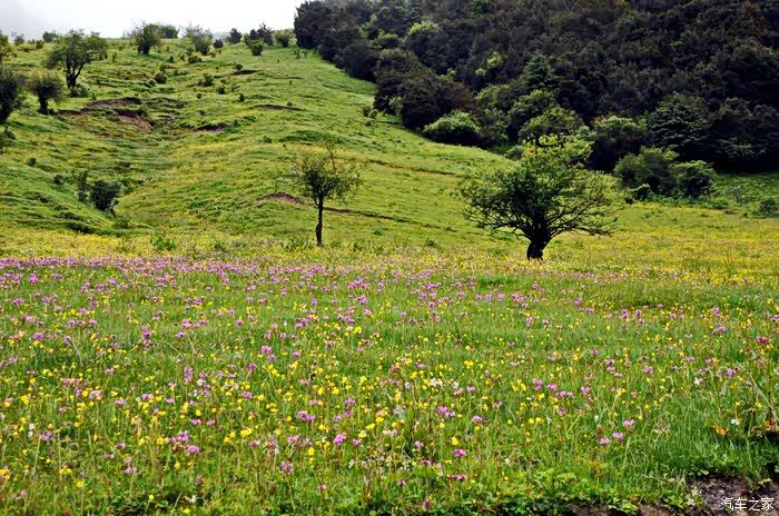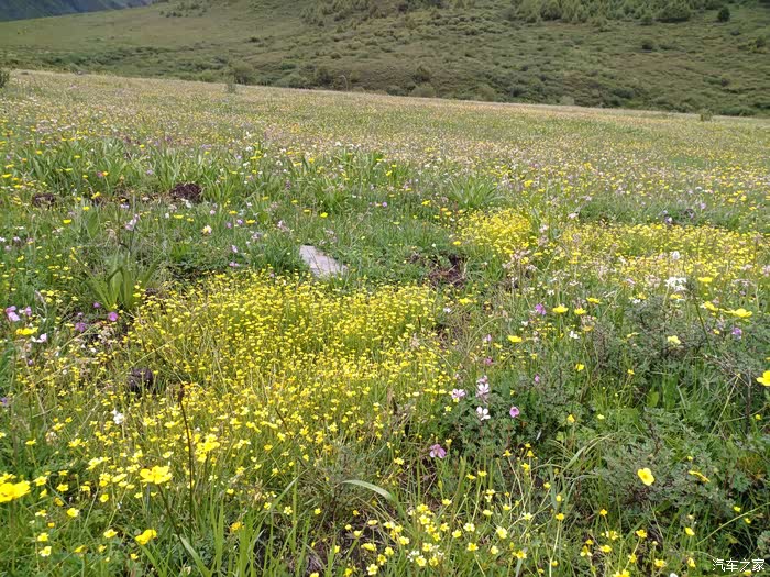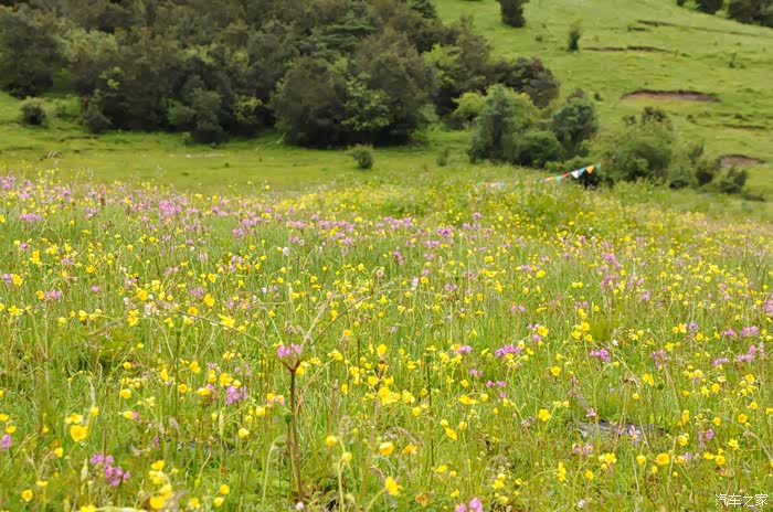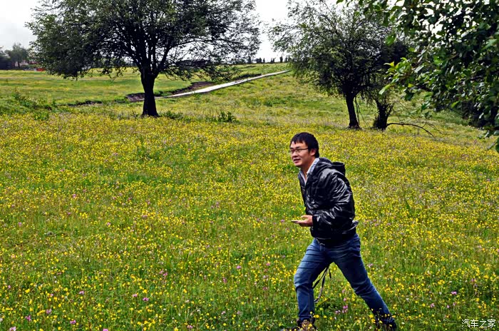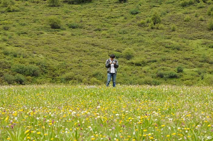 驾着D90继续前行,左边河岸的鲜花之地越来越多!牧民民居附近都是鲜花盛开之地!转过弯道,就发现有条弯道向右进入山区,红色精灵D90打头阵,开入便道进入大坪,然后对讲机里传来PeterTang的呼叫声音:“快上来,好漂亮的风景”!调头,转弯,驶入陡坡进入上坡,就发现左右两边盛开鲜花,道路两边景色诱人!右边是满眼低矮黄花,白色小花交叉盛开;左边这是紫色花朵盖满地,黄色小花印满眼!这片大坪花海面积广阔,蜿蜒道路尽头的牧民民居更是将这里的花海胜地进行点缀!抵制不住诱惑的PeterTang则连蹦带跳的进入右边黄色花海进行近拍:横排竖拍再摄影!心理感叹道这次寻花之旅终于可以提交任务了!
