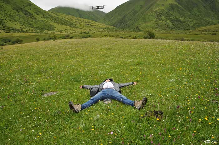 我们在国有牧场的工作人员的帮助下,PeterTang则用自带的汽化炉开始煮方便面,我则用自热饭来解决饥肠辘辘的温饱问题。在等待自热饭热气腾腾热饭的同时,放飞无人机远程查看山涧峡谷的花海之地。解决完毕我们的温饱问题后,进入山涧里面看花海只能步行而入!