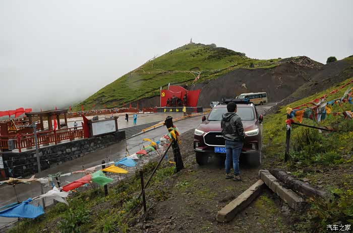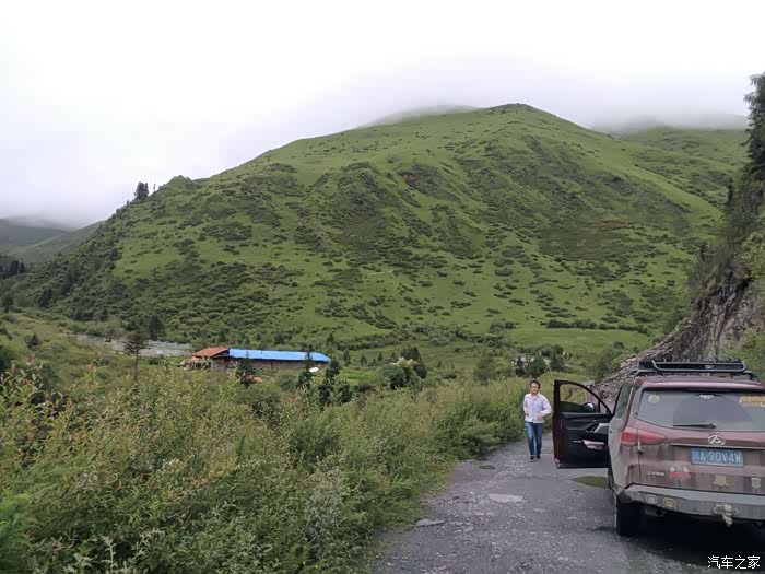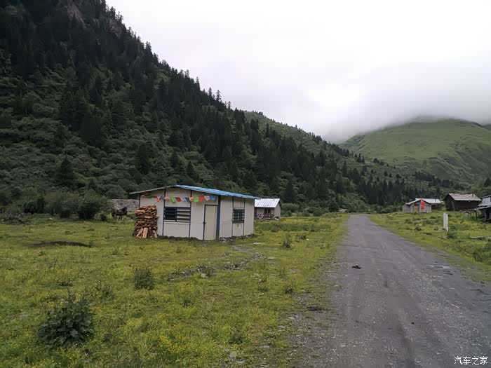 经历过几次牧民栅栏封路(提醒过往游客自行打开也需立即关闭),我们就来到这条马路的尽头,就到达国有牧场的居住地。低矮的红瓦石墙、翘檐漆门的藏房,两三条当地土狗,一面迎风飘扬的五星红旗,给这里宁静的高山峡谷间的宁静增添了许多生气。