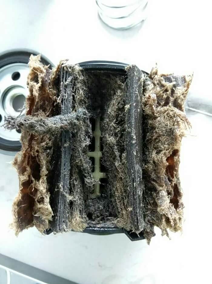 这是使用了47000公里的柴滤解剖图。根据4S说法,柴酷要到6万~8万左右更换。很显然他们是看了美国版说明书翻译版,本土可以,在国内不行
