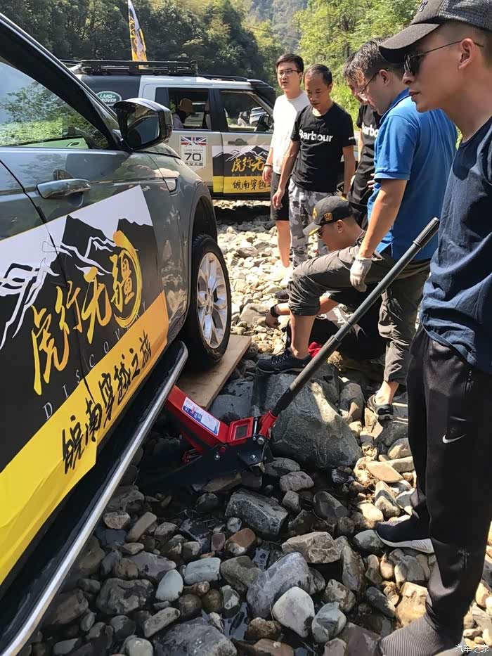 第一次出来越野的大律师煎饼侠同学,就在不经意间,被一个大石头磕破了轮胎内侧壁,导致爆胎。还好伟哥装备齐全,直接拿出液压千斤顶,大家齐心合力,已最快的速度帮助煎饼侠换上了备胎。